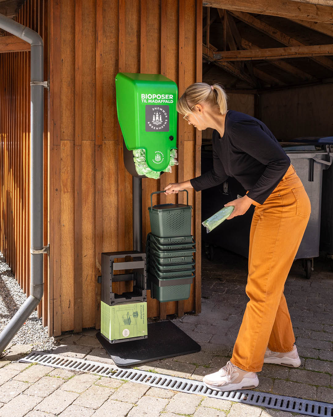 Vi kan hente holder, bioposer og køkkenkurv fra en stander i vores gård.
