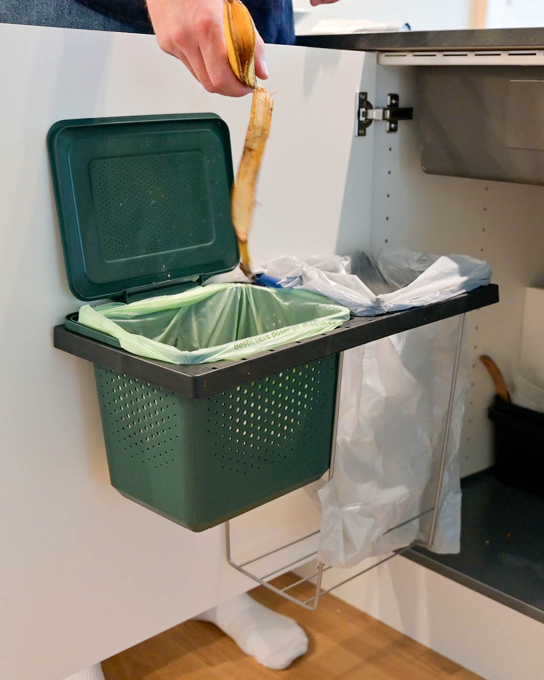Man klikker holderen ovenpå affaldsstativet på køkkenlågen. Så er der plads til både madaffald og restaffald under vasken.